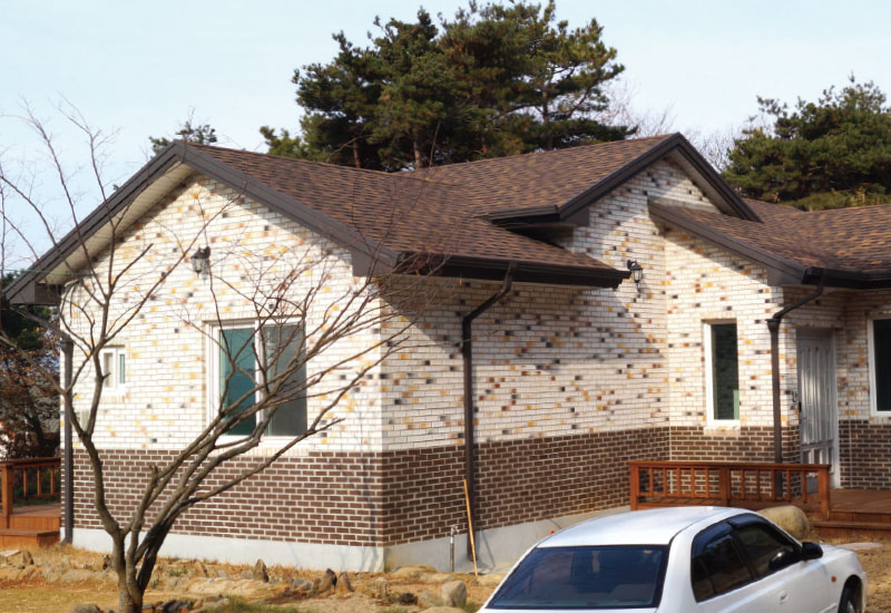 육각슁글 이중슁글 일반슁글 북유럽형의 유러피안 감각 이국적인 북유럽의 풍경을 선사해주는 아름다운 지붕재 아스팔트 슁글.아름다울 뿐만 아니라 내구성과 내풍성이 강하여 외부 충격에도 잘 견뎌줍니다. DOUBLE 이중슁글 이중슁글은 상하본드 사용으로 인한 강한 내구성과 내풍성을 가지고 있을 뿐만 아니라 입체적인 그림자 효과를 통해 아름다운 지붕을 만들어 줍니다. 우수한 내구성우수한 내풍성간편한 시공 제품 색상 StoneGray 돌회색DarkRed 흑적색LigntBrown 연밤색Black 검정색Gold 황금색Sunset 노을색DarkGreen 흑녹색DarkBrown 진밤색 제품 규격 규격 [Dimension]370mm X 1050mm 노출길이 [Exposure]162 mm 낱장개수 [Packing]14 pcs/bd 시공면적 [Operation Area]약 2.38 ㎡/bd 중량(abt.) [Weight]약 28 kg/bd 시공사례 DarkBrown 진밤색Sunset 노을색